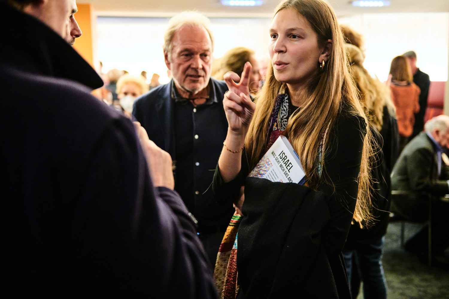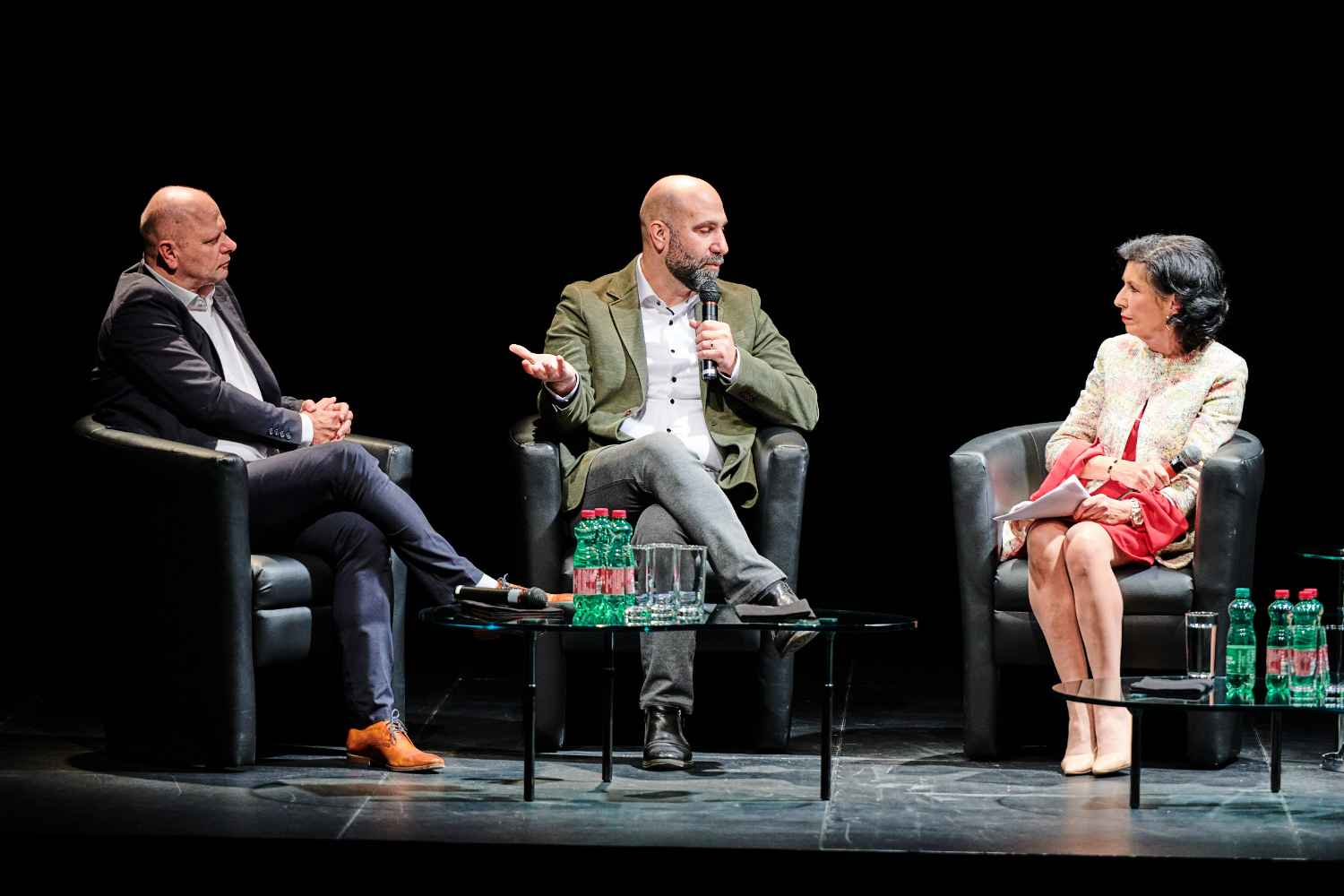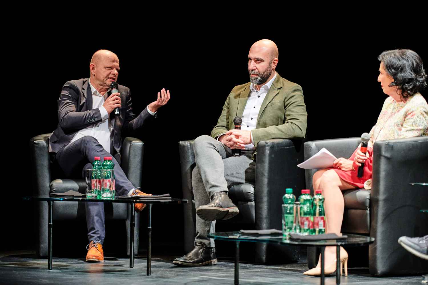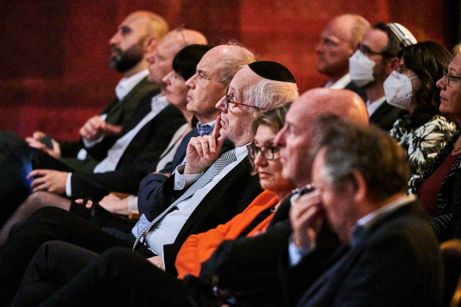 Auf dem Podium: Harry Bergmann, Ahmad Mansour, Doron Rabinovici, Esther Schapira, Robert Schindel, Ben Segenreich und Christian Ultsch. Moderation: Danielle Spera.